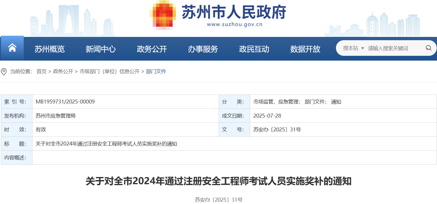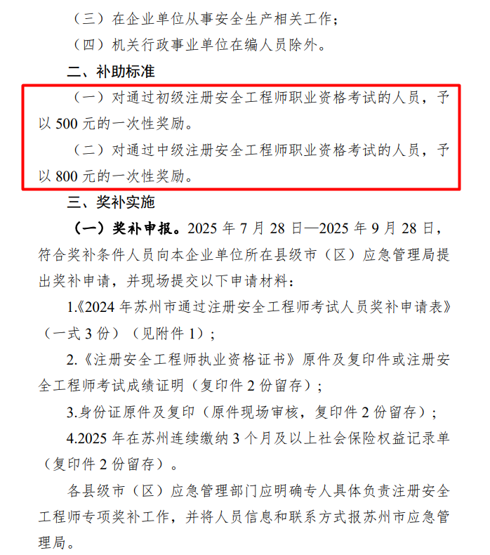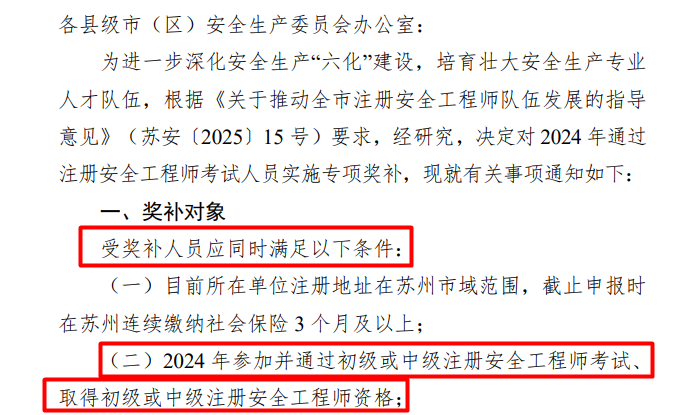 摘要:苏州对全市2024年通过注册安全工程师考试的人员实施奖补,初级注册安全工程师予以500元的一次性奖励,中级注册安全工程师予以800元的一次性奖励。
