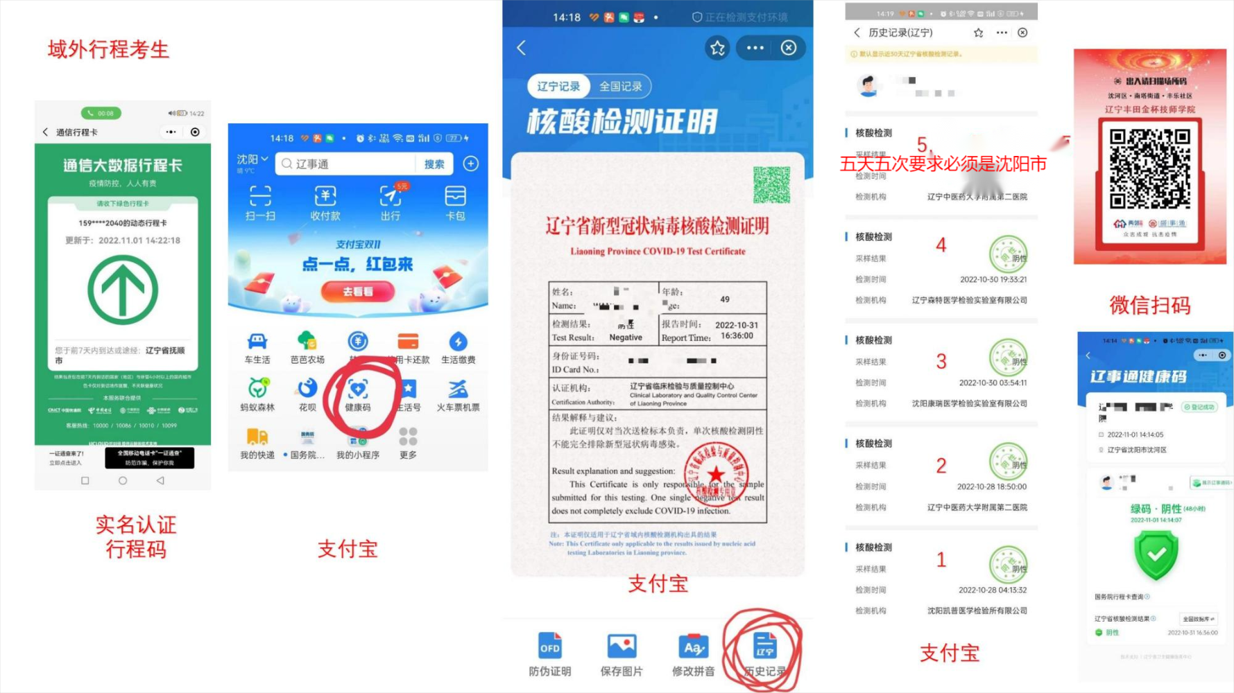 (5)24小时内(以出具报告时间为准)核酸检测阴性证明。※跨省或跨市参加考试的考生,需严格落实出发地和目的地属地核酸检测相关要求。目前沈阳市要求“非风险地区的来(返)沈人员要做到‘五天五检’,即抵沈5天内每日进行核酸检测,不得聚餐、不得聚会、不得去公共场所、不得乘坐公共交通工具。需要外出的,做到‘两点一线’,做好个人防护。”(《沈阳市新冠肺炎疫情防控指挥部通告(第69号)》)。则入场时必须提供相应次数的核酸检测阴性报告(可通过“辽事通健康码”查询核酸检测历史记录),并请考生随时关注沈阳市疫情防控指挥部最新要求。因“五天五检”要求,非风险地区的来沈参加11月12日考试的,须11月6日前抵沈;参加11月13日考试的须11月7日前抵沈。