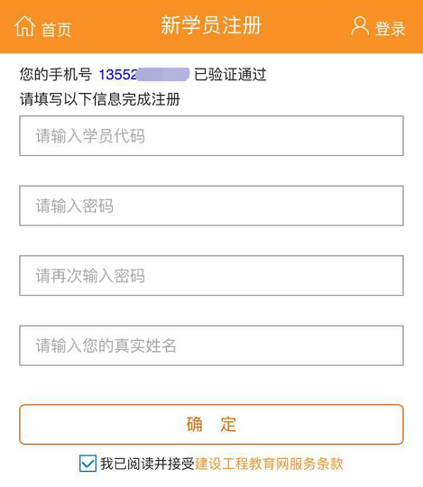 输入想注册的学员代码,输入密码、真实姓名,以及阅读并接受医学教育网服务条款后点击确定。