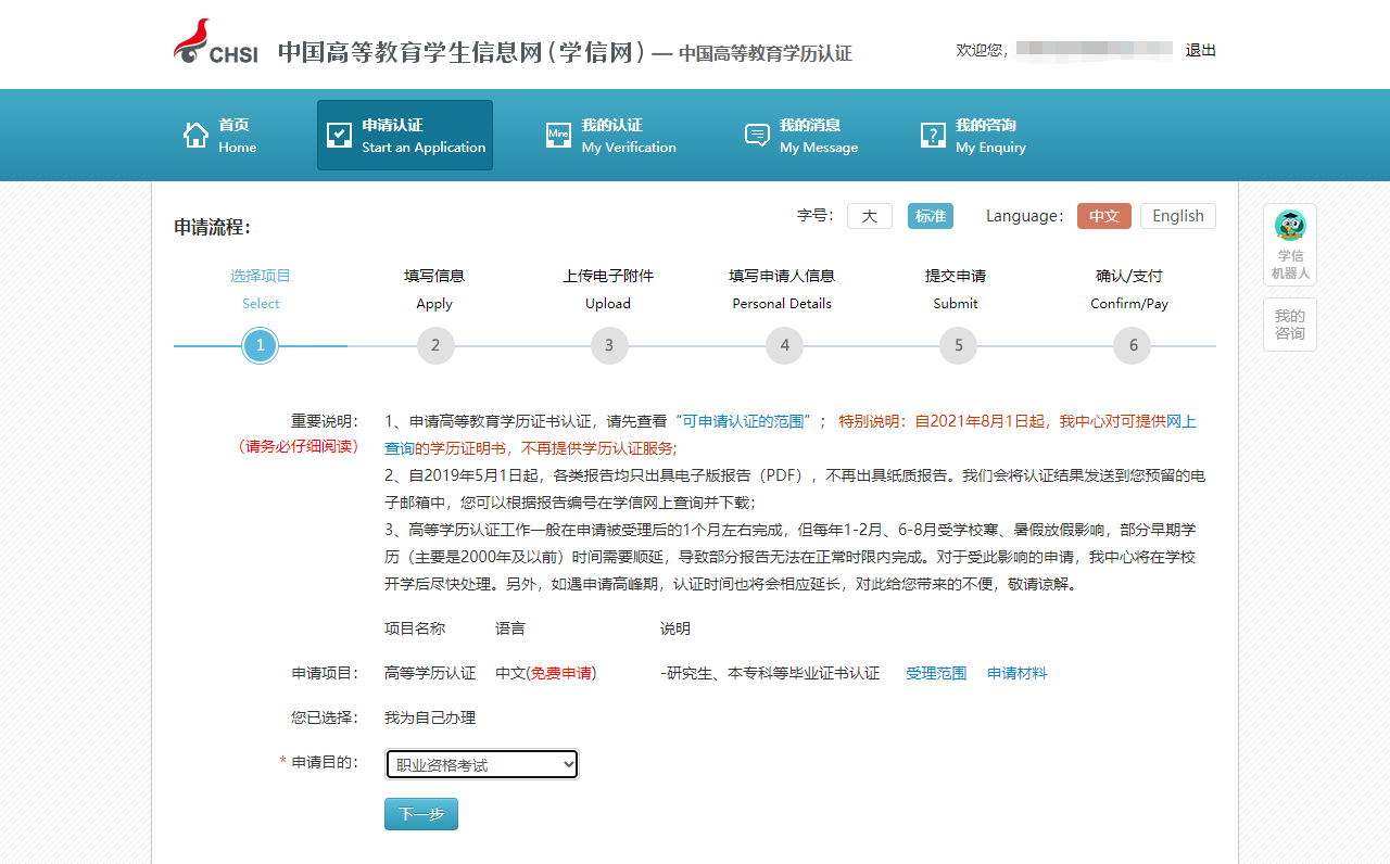 7.按照要求完成申请。