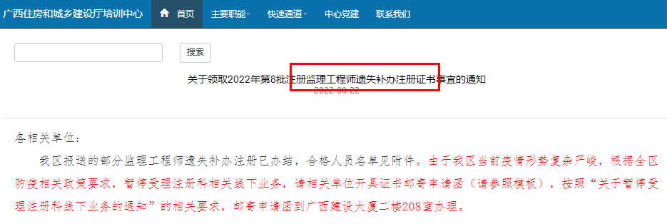 我区报送的部分监理工程师遗失补办注册已办结,合格人员名单见附件。由于我区当前疫情形势复杂严峻,根据全区防疫相关政策要求,暂停受理注册科相关线下业务,请相关单位开具证书邮寄申请函(请参照模板),按照“关于暂停受理注册科线下业务的通知”的相关要求,邮寄申请函到广西建设大厦二楼208室办理。