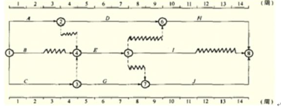 14、某工程双代号时标网络计划如下图所示: