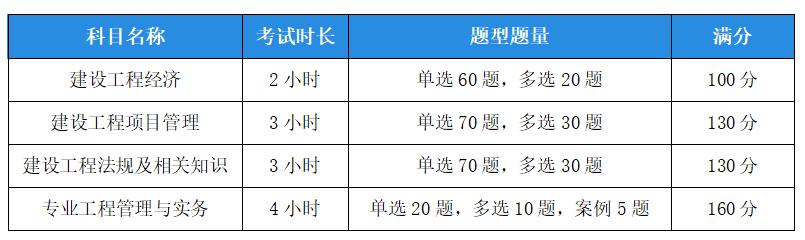 公共科目为《建设工程经济》、《建设工程项目管理》、《建设工程法规及相关知识》,试题的题型分为单项选择题和多项选择题;专业科目为《专业工程管理与实务》,试题的题型分为单项选择题、多项选择题、案例分析题。