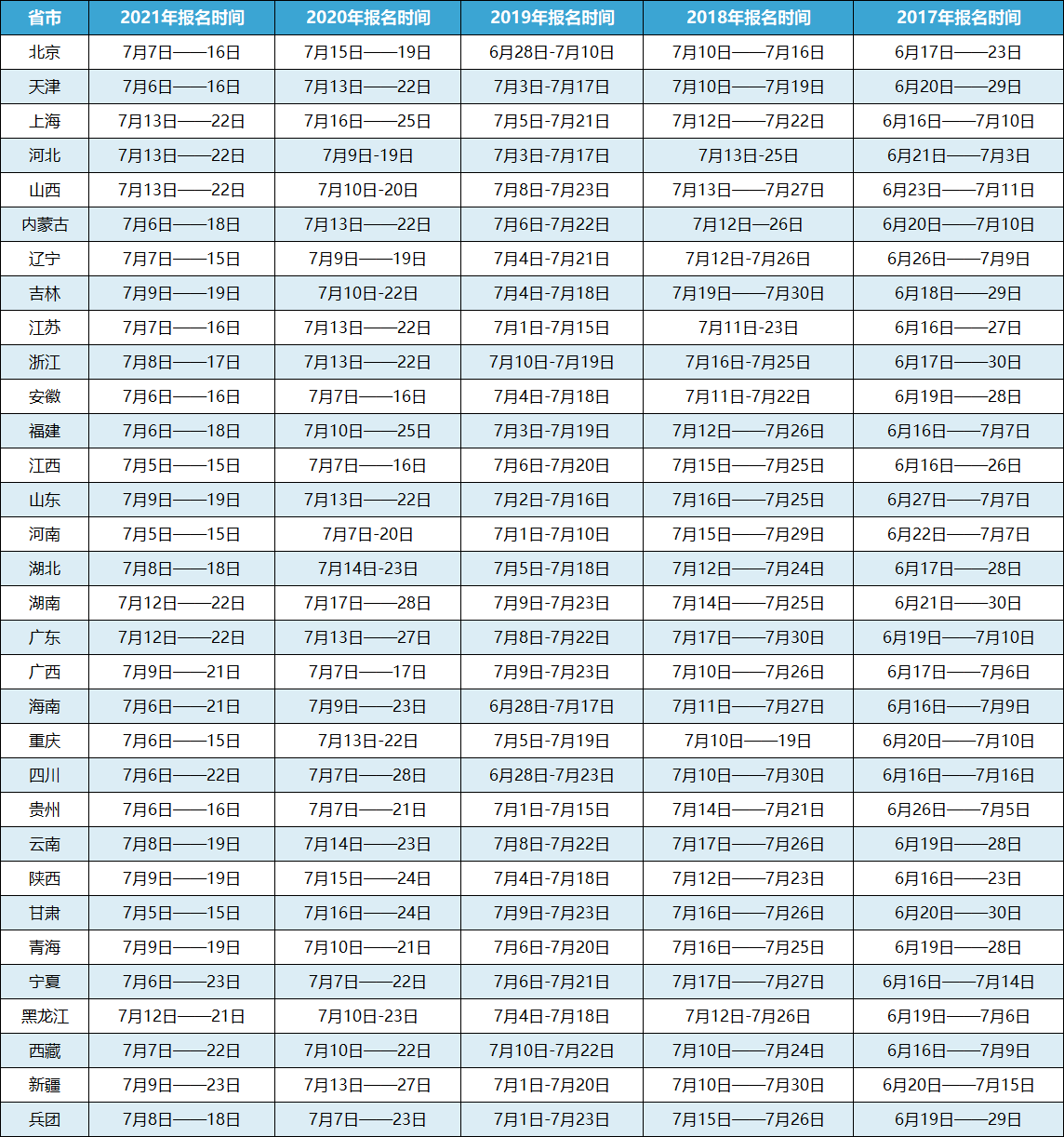 2017-2021年一建考试报名时间汇总