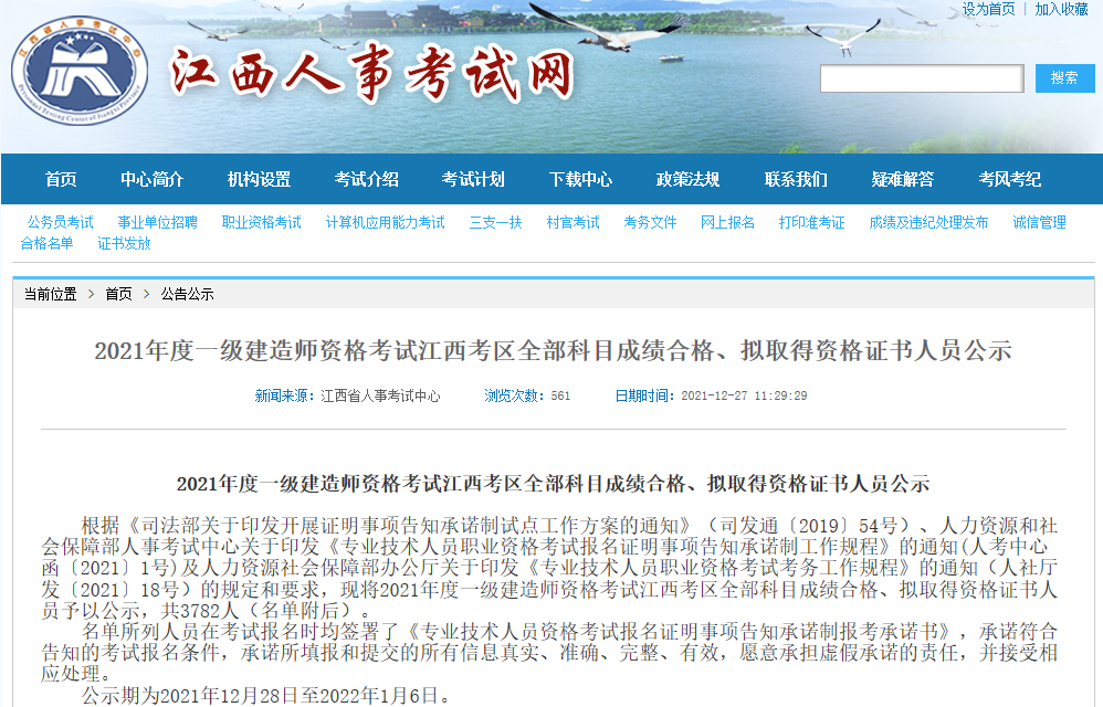 江西2021年一级建造师资格考试成绩合格、拟取得资格证书人员公示