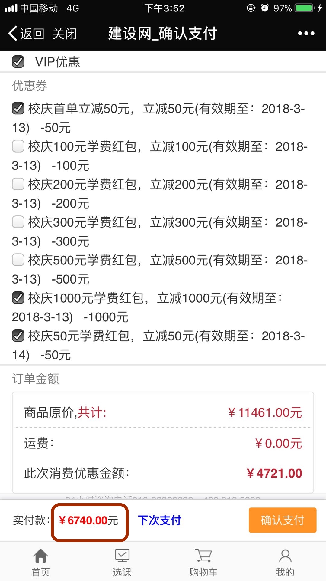 第五步:选好课程进入支付页面,选择可用的优惠券红包,享受优惠购课,完成支付即可。