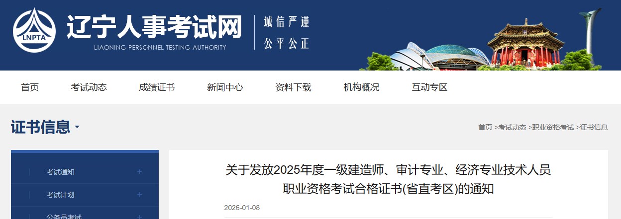 辽宁人事考试网发布关于发放2025年度一级建造师、审计专业、经济专业技术人员职业资格考试合格证书(省直考区)的通知,具体信息如下: