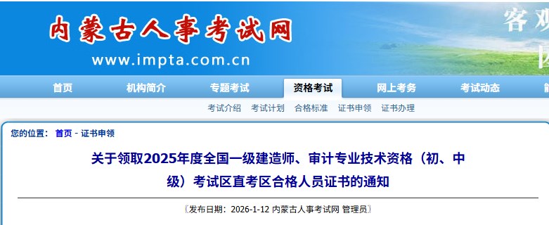 内蒙人事考试网发布关于领取2025年度全国一级建造师、审计专业技术资格(初、中级)考试区直考区合格人员证书的通知,具体信息如下: