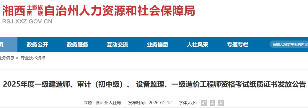 湘西自治州人力资源和社会保障局发布2025年度一级建造师、审计(初中级)、设备监理、一级造价工程师资格考试纸质证书发放公告,具体信息如下: