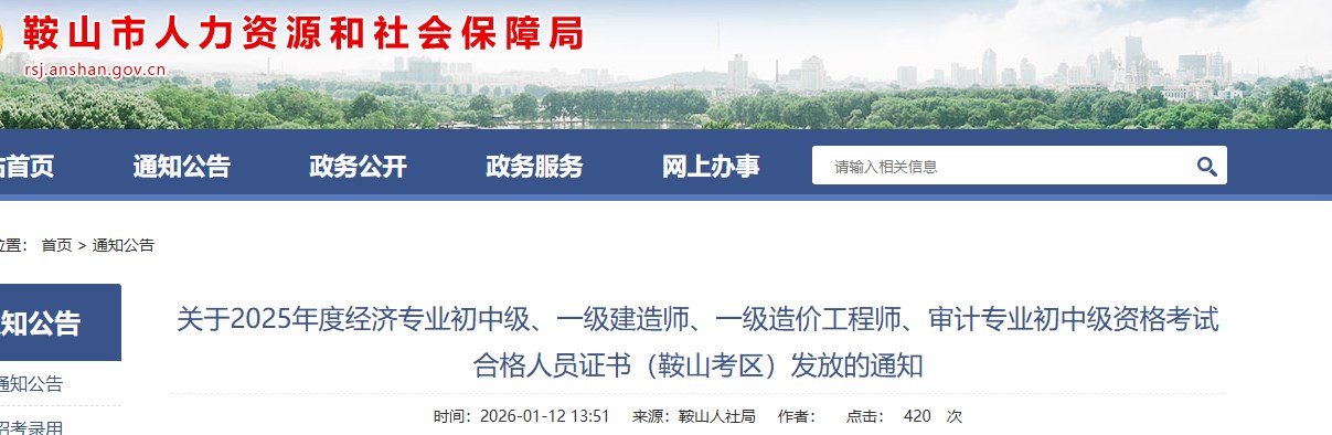 2025年度经济专业初中级、一级建造师、一级造价工程师、审计专业初中级资格考试合格人员证书(鞍山考区)定于2026年1月13日开始发放,现将有关工作安排通知如下: