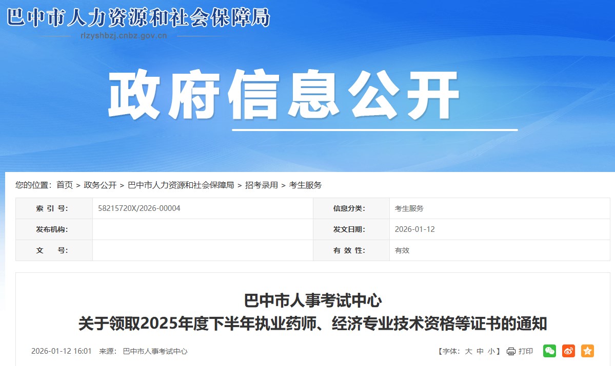 巴中市人事考试中心关于领取2025年度下半年执业药师、经济专业技术资格等证书的通知,具体信息如下: