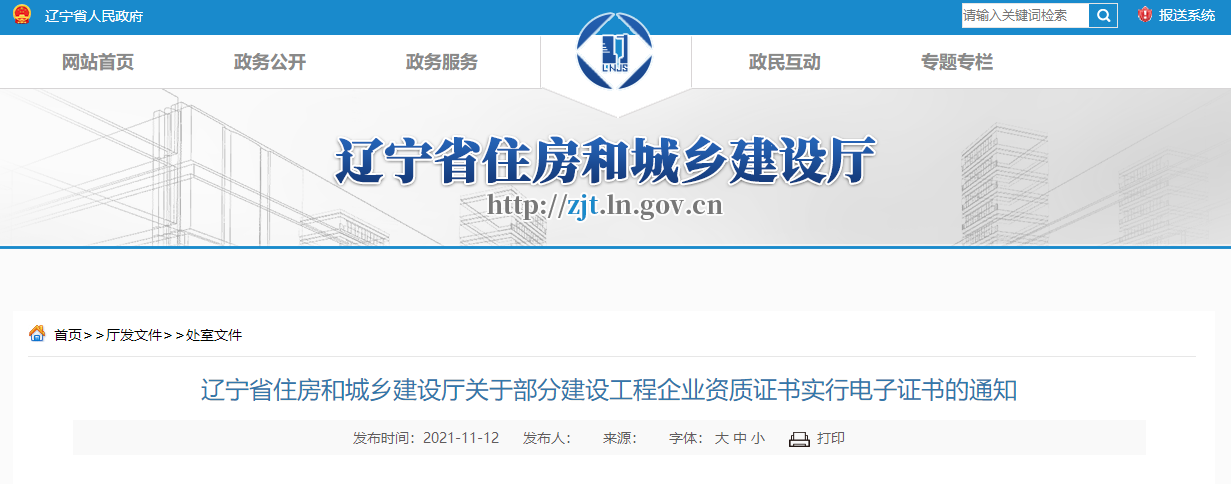 辽宁省住房和城乡建设厅发布《关于部分建设工程企业资质证书实行电子证书的通知》,自即日起,辽宁省住房和城乡建设厅负责核发的建筑业企业资质证书、工程勘察资质证书、工程设计资质证书、工程监理资质证书、建设工程质量检测机构资质证书实行电子证书。上述电子证书,一并纳入辽宁省电子证照系统统一管理。详情如下: