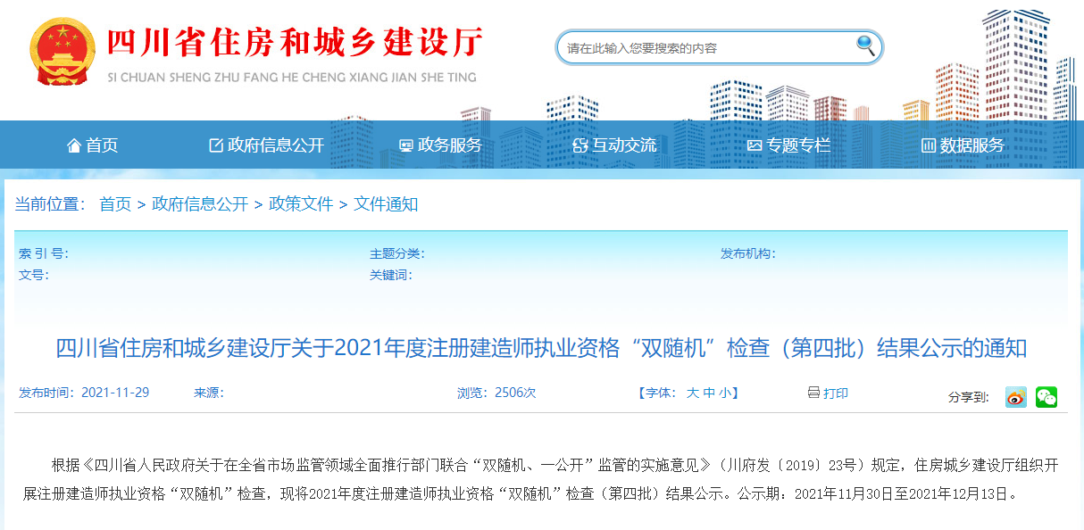 根据《四川省人民政府关于在全省市场监管领域全面推行部门联合“双随机、一公开”监管的实施意见》(川府发〔2019〕23号)规定,住房城乡建设厅组织开展注册建造师执业资格“双随机”检查,现将2021年度注册建造师执业资格“双随机”检查(第四批)结果公示。公示期:2021年11月30日至2021年12月13日。