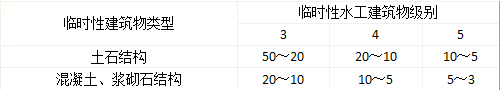 【答案解析】 本题考查的是水利水电工程洪水标准。临时性水工建筑物的洪水标准,应根据建筑物的结构类型和级别,在下表的幅度内合理选用。参见教材P18。