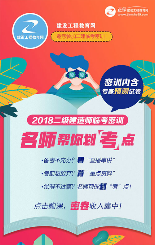 距离2018年二级建造师考试只剩不到10天了,这个阶段是考前关键时刻,切不要因为之前没有好好复习而放弃,临时抱佛脚依旧有用!建设工程教育网特推出二级建造师《临考密训班》,助你考前临门一脚!