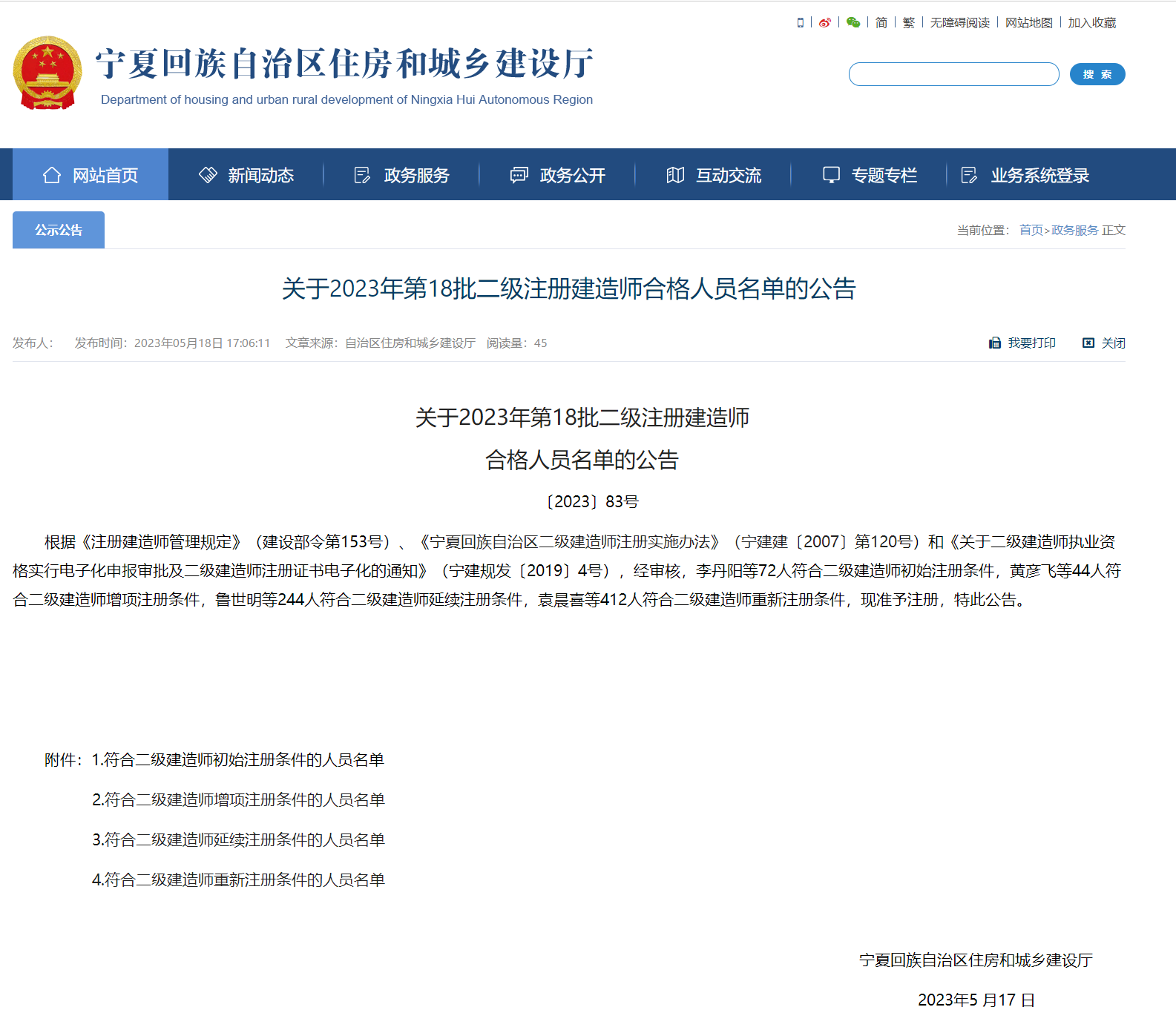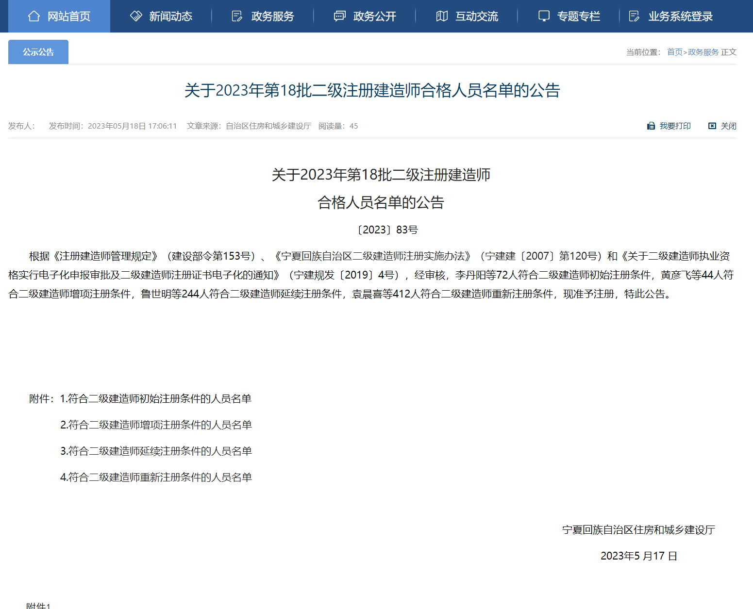 宁夏回族自治区住房和城乡建设厅发布【关于2023年第18批二级注册建造师合格人员名单的公告】,内容如下: