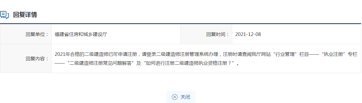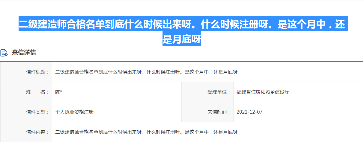 福建省住房和城乡建设厅对收到二级建造师合格名单到底什么时候出来呀。什么时候注册呀。是这个月中,还是月底呀?问题作出了回复。相关如下