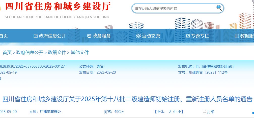 四川省住房和城乡建设厅发布关于2025年第十八批二级建造师初始注册、重新注册人员名单的通告,具体内容如下: