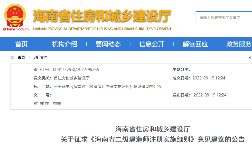 根据《注册建造师管理规定》(建设部令第153号)等相关法律规定,拟定了《海南省二级建造师注册实施细则》,现将《海南省二级建造师注册实施细则》向社会予以公示,广泛征求意见建议。