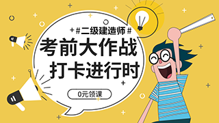 二级建造师报名即将落下帷幕,考生们开始投入最后的冲刺备考中,但很多考生都会反映时间不够,二级建造师教材还未看,或者看了以后记不住,实务题反复出错,怎么办?这个时候建设工程教育网为你们贴心的准备了2019年二级建造师考前抢分大作张,每天参与打卡赢取精品好课,既能学习知识,又能赢取礼品,这样的好事你还在等什么!立即加入打卡队伍>>