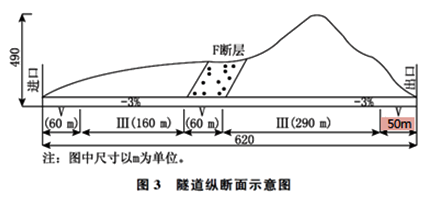 某双车道公路隧道,全长620m,地层岩性为石灰岩,地下水较丰富。有一条F断层破裂带,隧道最大埋深490m,纵坡为﹣3%。其围岩级别及长度见隧道纵断面示意图。合同总工期为20个月。