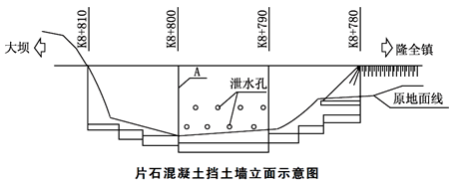 『正确答案』挡土墙位于路基左侧,因为立面图中从左到右里程是由大到小(或:当人站在挡土墙起点桩号K8+780向挡土墙终点桩号K8+810看时,挡墙位于人的左侧)。构造A为沉降缝与伸缩缝。