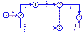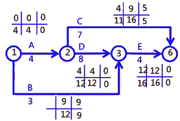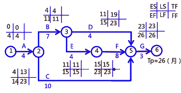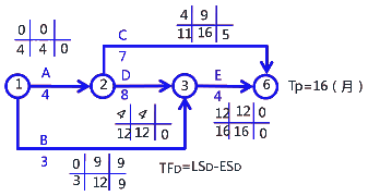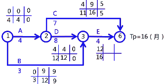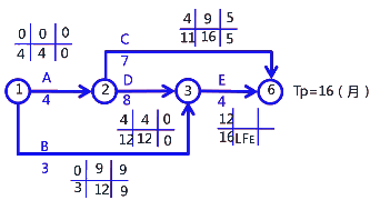 施工项目部将承包的施工任务分解成6个工作,并根据它们的逻辑关系和计划持续时间编制了施工进度计划双代号网络图如下(单位:月)