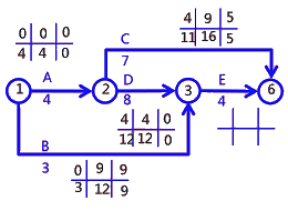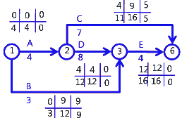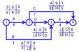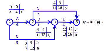某住宅工程,砖混结构,地上7层。施工项目部将整个施工任务划分成5个工作(A、B、C、D、E)。编制了施工进度计划双代号网络图如下(单位:月)