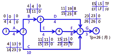 某住宅工程,砖混结构,地上7层。施工项目部将整个施工任务划分成7个工作(A、B、C、D、E、F、G)。编制了施工进度计划双代号网络图如下(单位:月)