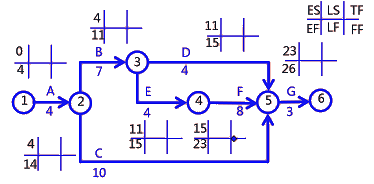 ①按照从起点向终点顺序逐个计算每项工作的ES,EF