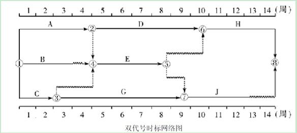 双代号时标网络计划是以时间坐标为尺度编制的网络计划,以实箭线表示工作,以虚箭线表示虚工作,以波形线表示工作的自由时差。
