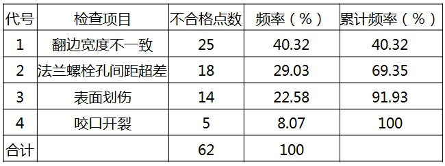 故翻边不一致、法兰螺栓孔间距超差为A类影响因素,表面划伤为B类影响因素,咬口开裂为C类影响因素。