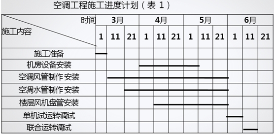 A安装公司进场后,因建设单位采购的设备晚于风管制作安装的开工时间,A安装公司及时联络空调设备供应商,了解设备的各类参数及到场时间并与B建筑公司协调交叉配合施工的时间与节点,编制了施工进度计划(见表1)并根据施工进度计划,制定了能体现合理施工顺序的作业进度计划。为保证安装质量,A安装公司将冷水机组、冷冻冷却水管安装找正等施工工序设置为质量控制点。