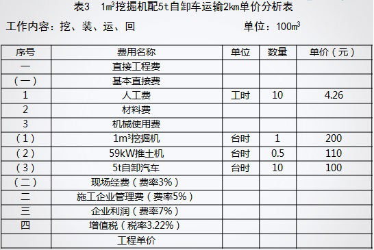 事件2:某投标文件中,基坑开挖采用1m3挖掘机配5t自卸车运输2km,其单价分析表部分信息如表3所示。