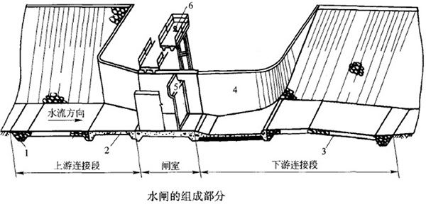 1) 指出水闸组成部分图示中1~6分别代表的名称是什么?水闸的施工放样内容哪些?