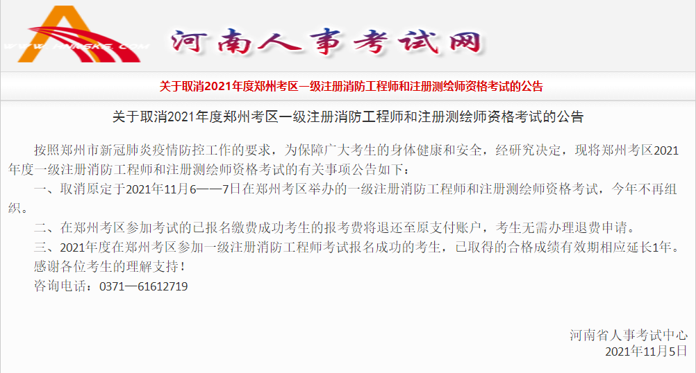 一、取消原定于2021年11月6——7日在郑州考区举办的一级注册消防工程师和注册测绘师资格考试,今年不再组织。