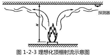 (2)顶棚射流。当烟气羽流撞击到房间的顶棚后,沿顶棚水平运动,形成一个较薄的顶棚射流层,称为顶棚射流。由于它的作用,使安装在顶棚上的感烟探测器、感温探测器和洒水喷头产生响应,实现自动报警和喷淋灭火。