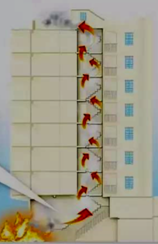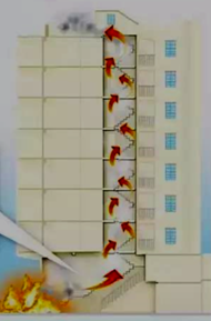 若火风压等于或小于进风口的压力,则烟火便全部从内部蔓延,当它进入楼梯间、电梯井、管道井、电缆井等竖向孔道以后,会大大加强烟囱效应。
