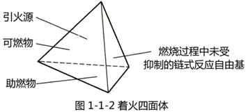因此,可以用着火四面体来表示有焰燃烧的四个条件,即可燃物、助燃物、引火源和链式反应自由基。
