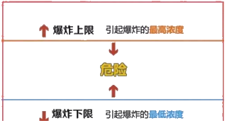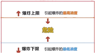能引起爆炸的最高浓度称为爆炸上限,能引起爆炸的最低浓度称为爆炸下限,上限和下限之间的间隔称为爆炸范围。