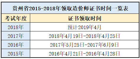 建设工程教育网为贵州地区的学员们统计了2015年至2018年贵州一级造价工程师证书的领取时间,具体时间表如下: