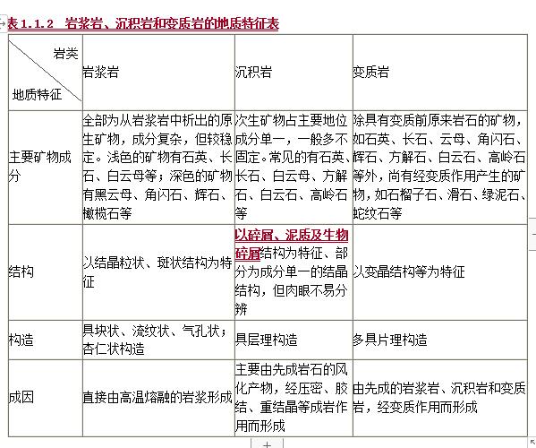 三大类岩石的主要区别。根据上述三大类岩石的特征描述,现将它们之间的主要区别归纳如表1.1.2。