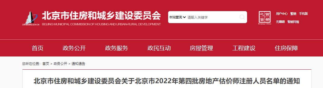 北京市住房和城乡建设委员会关于北京市2022年第四批房地产估价师注册人员名单的通知