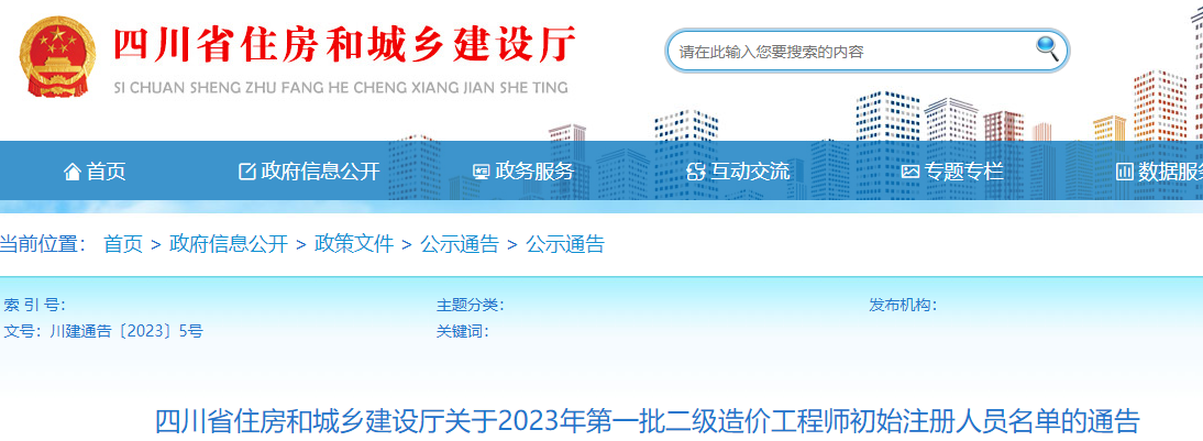 四川省住房和城乡建设厅关于2023年第一批二级造价工程师初始注册人员名单的通告
