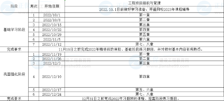 1、整体进度说明:本计划表从2022年10月1日开始执行,计划于2022年12月31日结束,共计13周;其中:基础学习阶段安排7周,巩固强化阶段安排6周。学员可根据本表的提示,结合自己的工作,学习情况进行细化,并按网校要求完成听课、做题的学习任务,基本可满足考试需要。