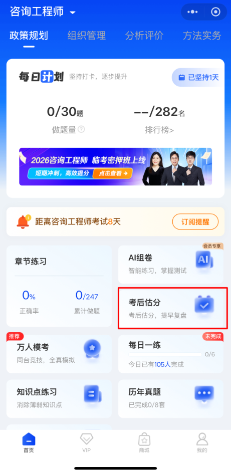 方式二:微信搜索“正保刷题宝”小程序,选择咨询工程师,点击“考后估分”进入-选择要估分的科目进行估分。