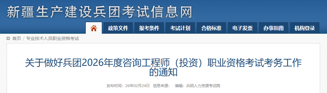 新疆生产建设兵团考试信息网发布关于做好兵团2026年度咨询工程师(投资)职业资格考试考务工作的通知,具体信息如下: