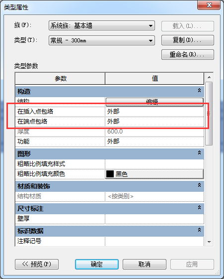 如上图,墙设置里在插入点包络指的是门窗等插入点包络,外部指核心层外部包络,内部指核心层内部包络,两者指内部外部都包络。包络的具体位置由插入构件的勾选“墙闭合”的参照平面决定。