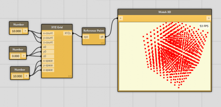 方法一(XTZ Grid):利用XYZ Grid运算器生成,原理是输入X、Y、Z方向的参照点数量,起始点和步距(偏移量),生成可控数量、起始点、步距的参照点图形(包括Cube)。分析:此条件生成的参照点为每边10个点,9段,间距为10,共10X10X10点。