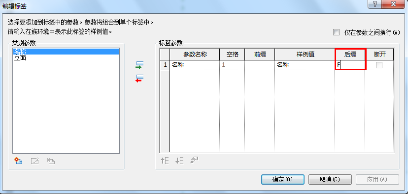 进入族编辑后选择名称然后在修改标签选项卡下点击编辑标签,弹出的对话框后在后缀一栏中输入大写F(如图-4所示)点击确定。